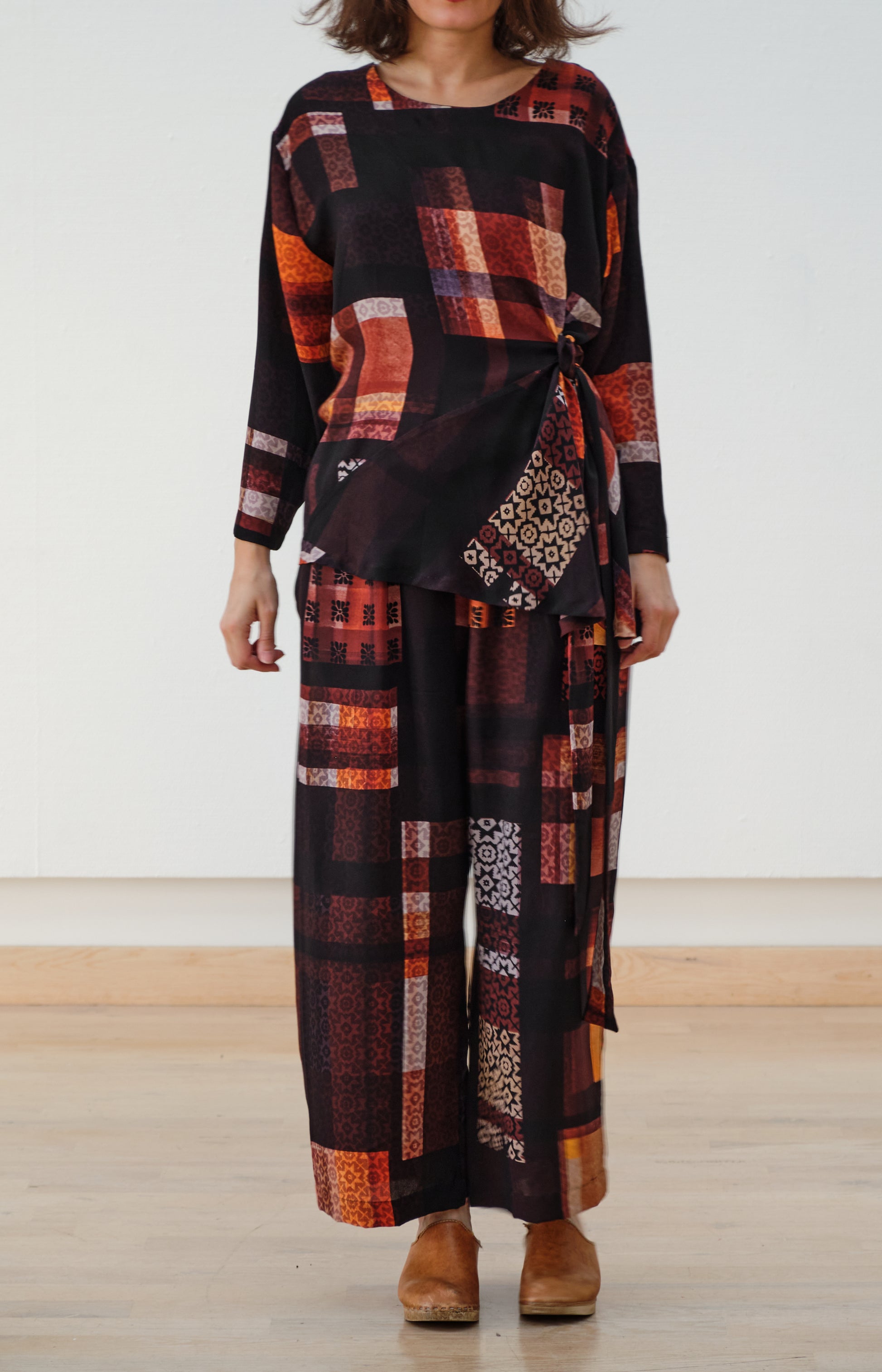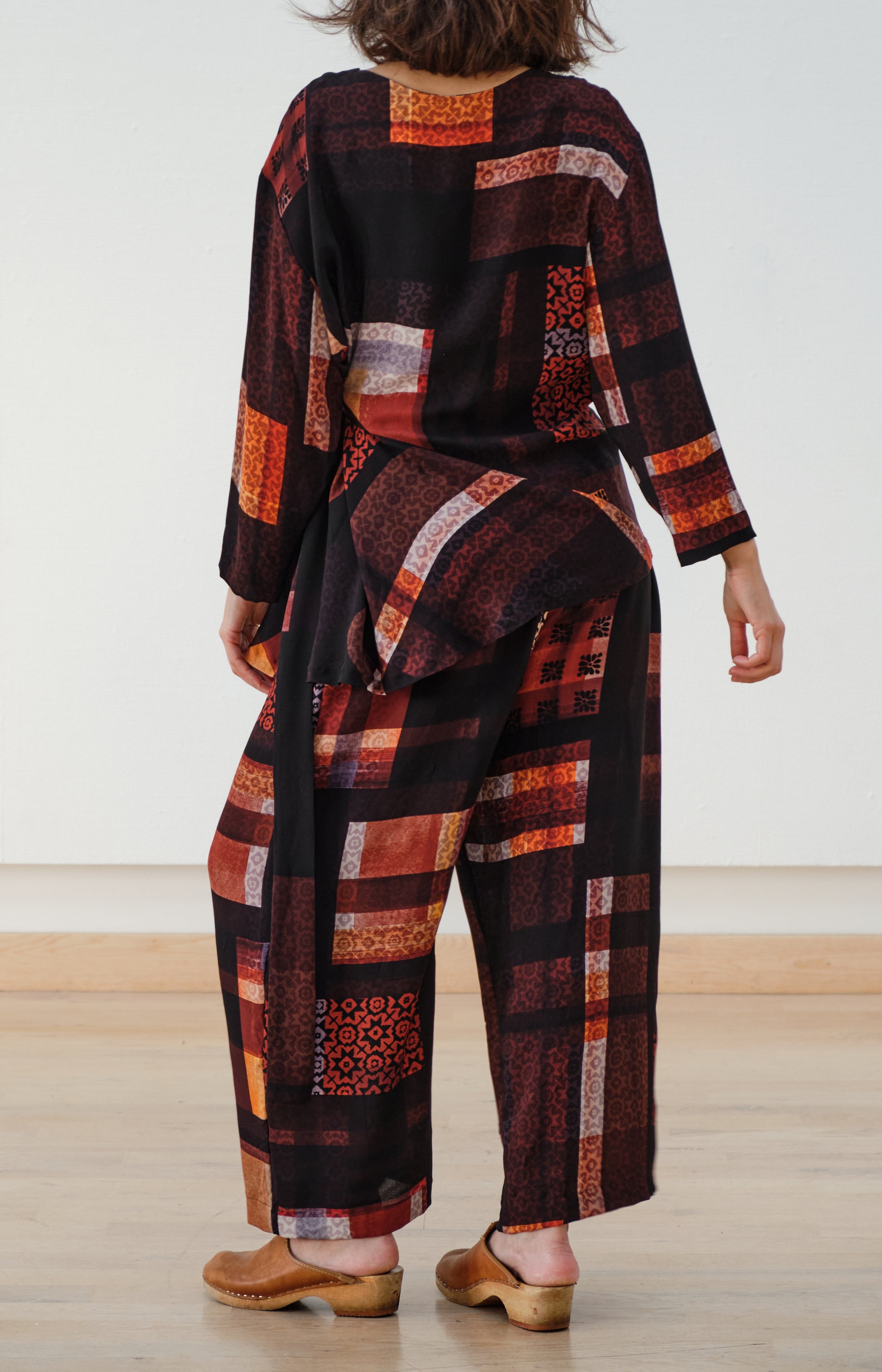 The peplum on the blouse is cut on the bias of the fabric to give a more fluid look. Matching trousers available.