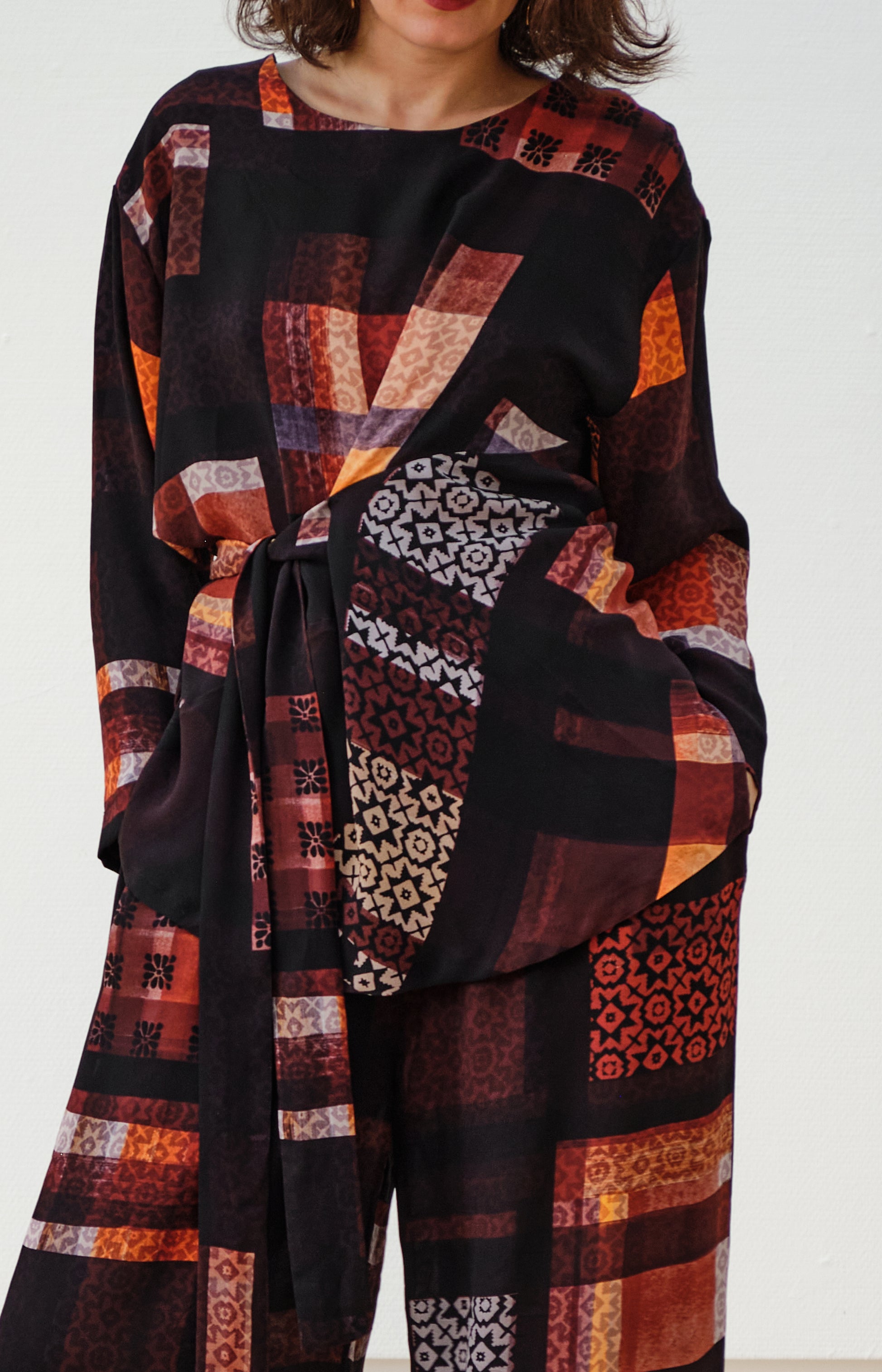 The blouse has a relaxed fit, dropped shoulder and a waistband to tie in various ways.