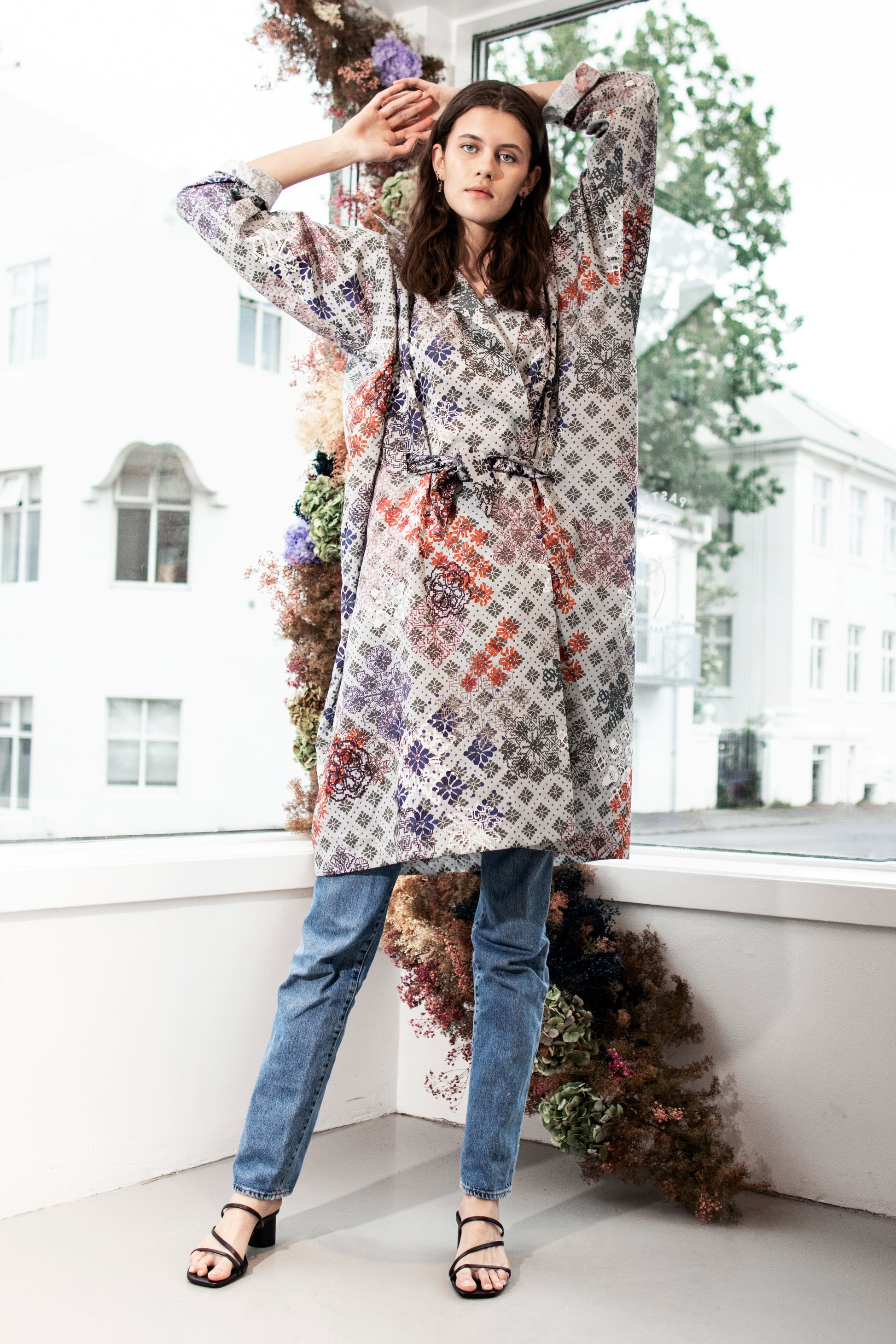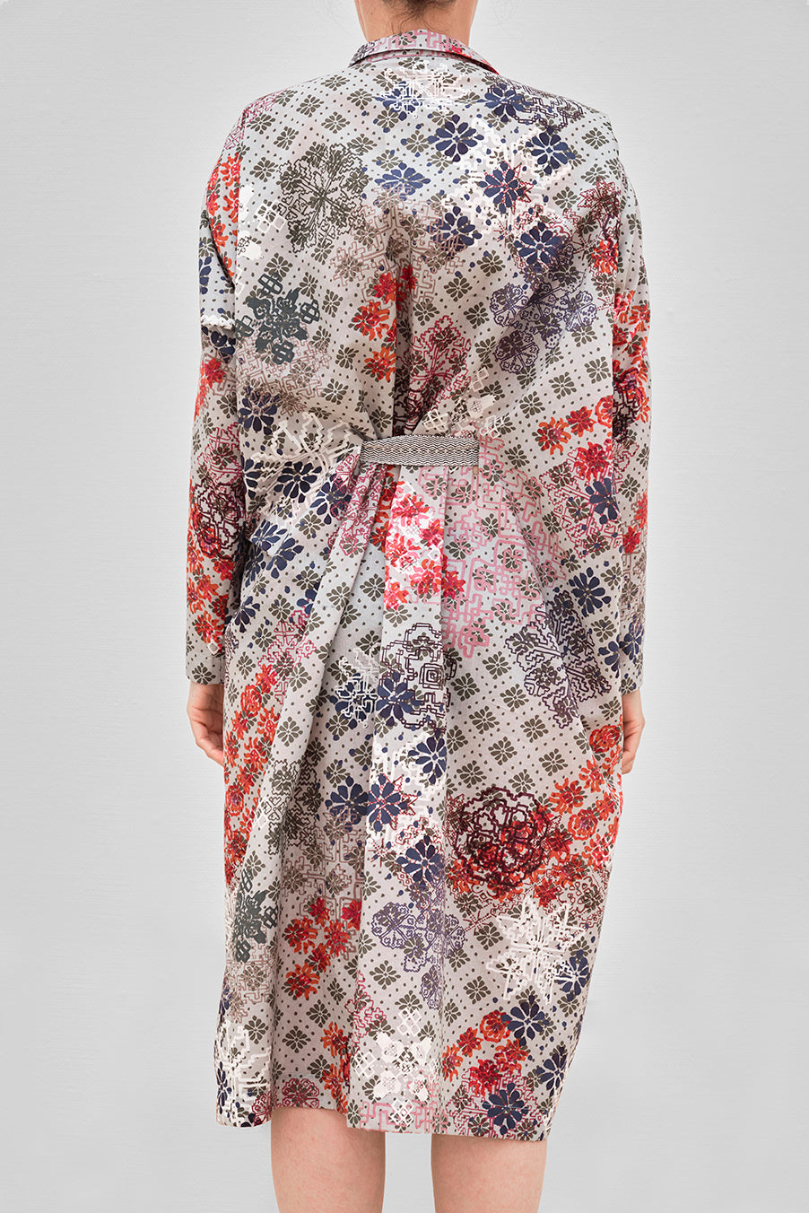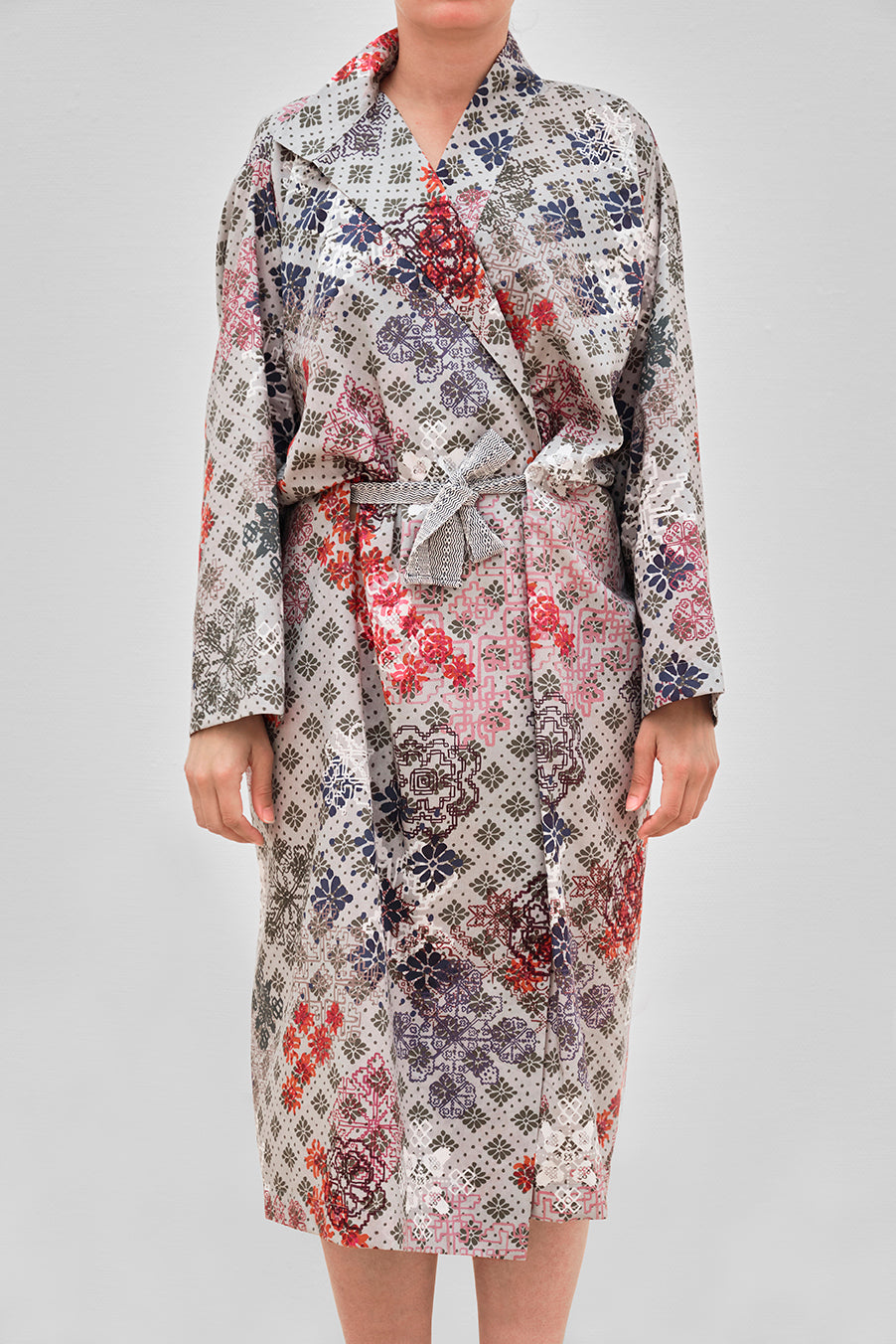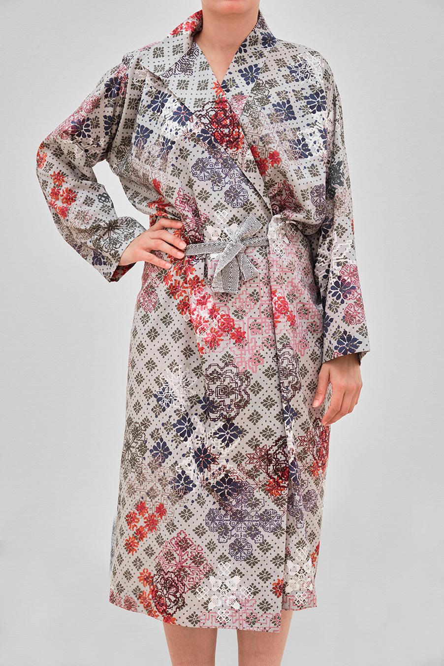 Flowing and loose fit with asymmetrical collar. Fine cotton/silk blend. Removable woven cotton belt which can be threaded into slits on the front and back of the robe.