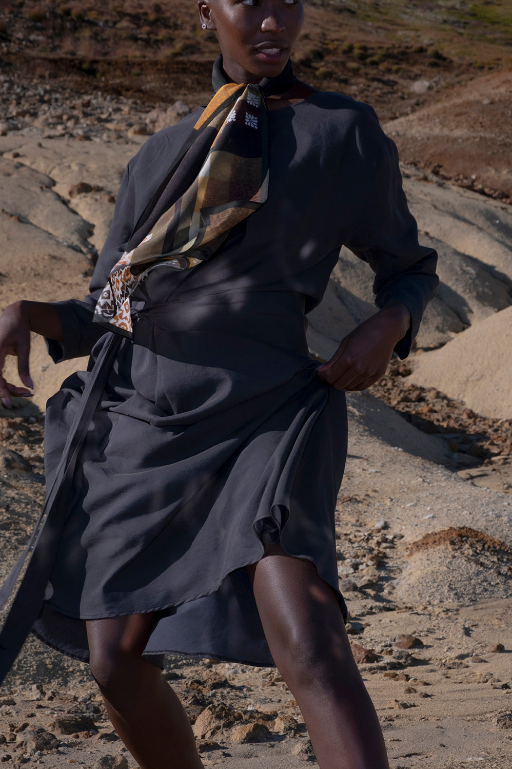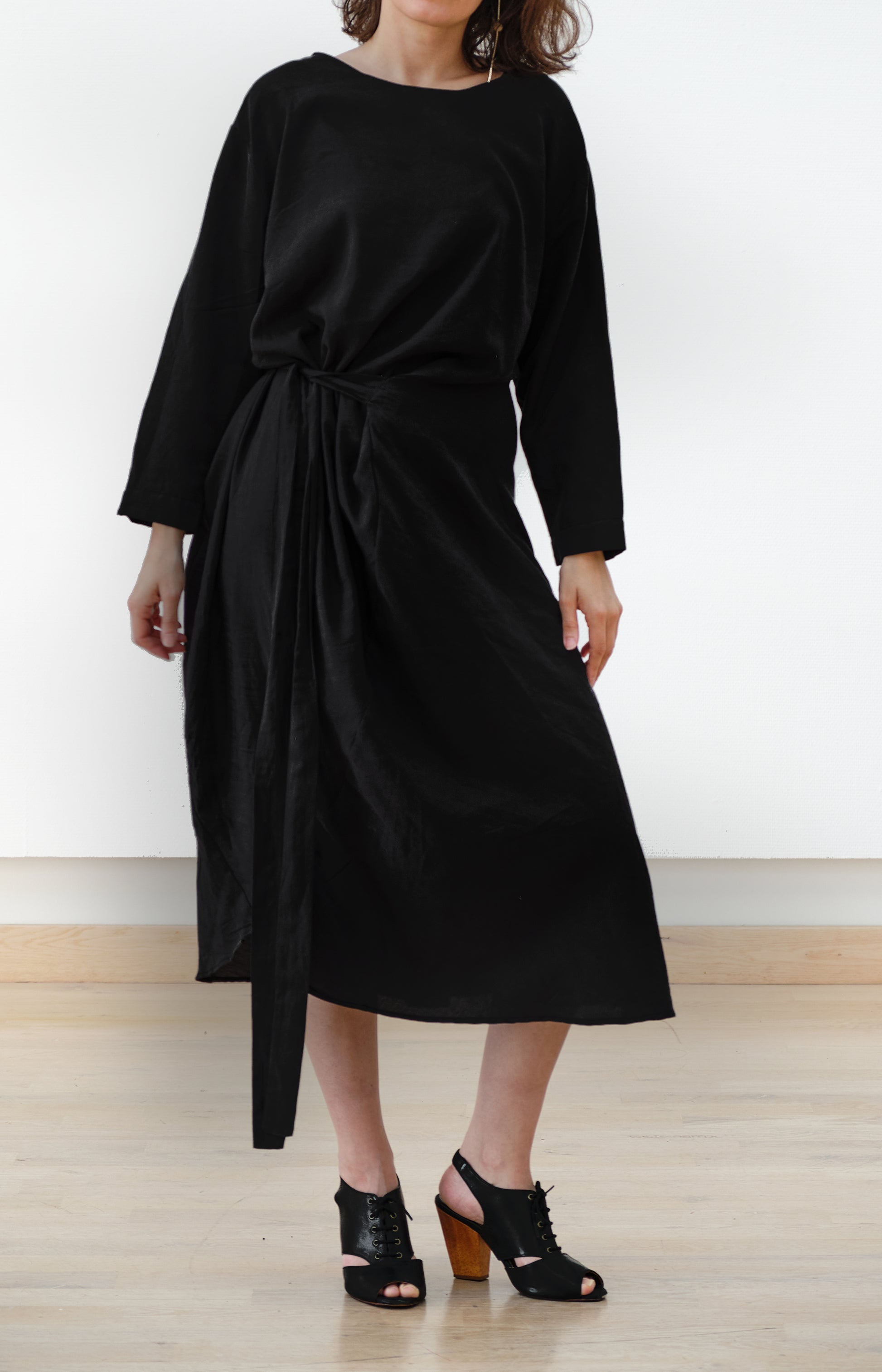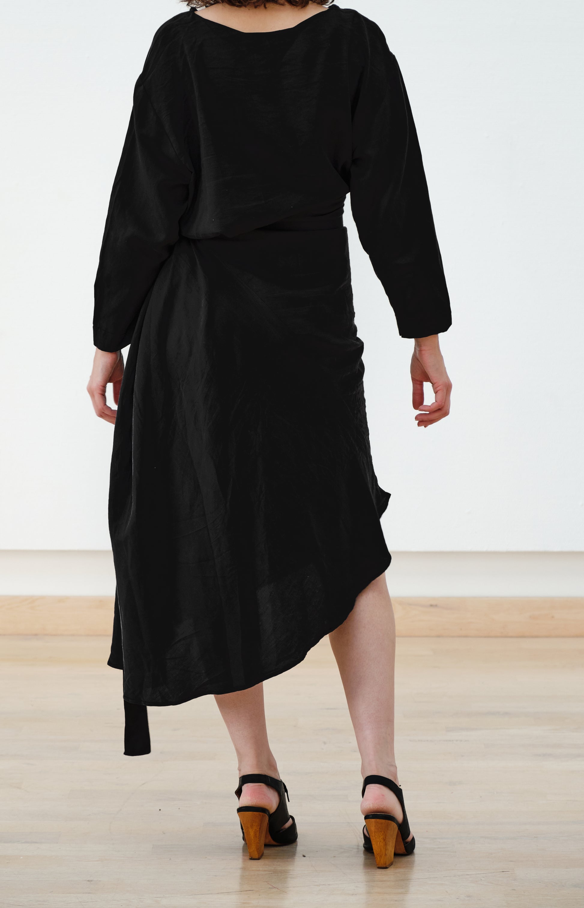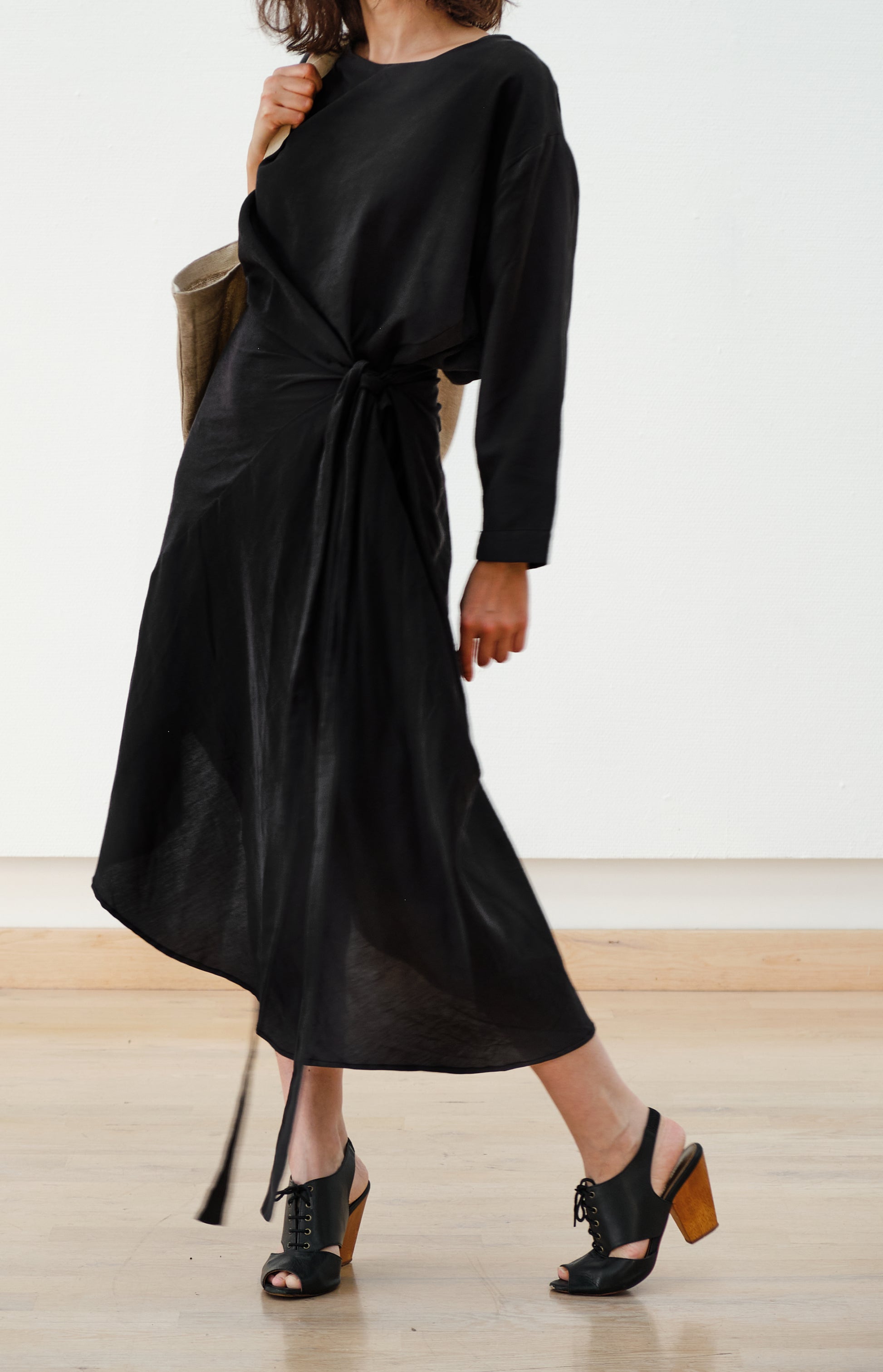 Our Knot dress in black satin Tencel. Loose fit. Can be worn in different ways using the waistband. The skirt is cut on the bias of the fabric to give the dress a more fluid look.