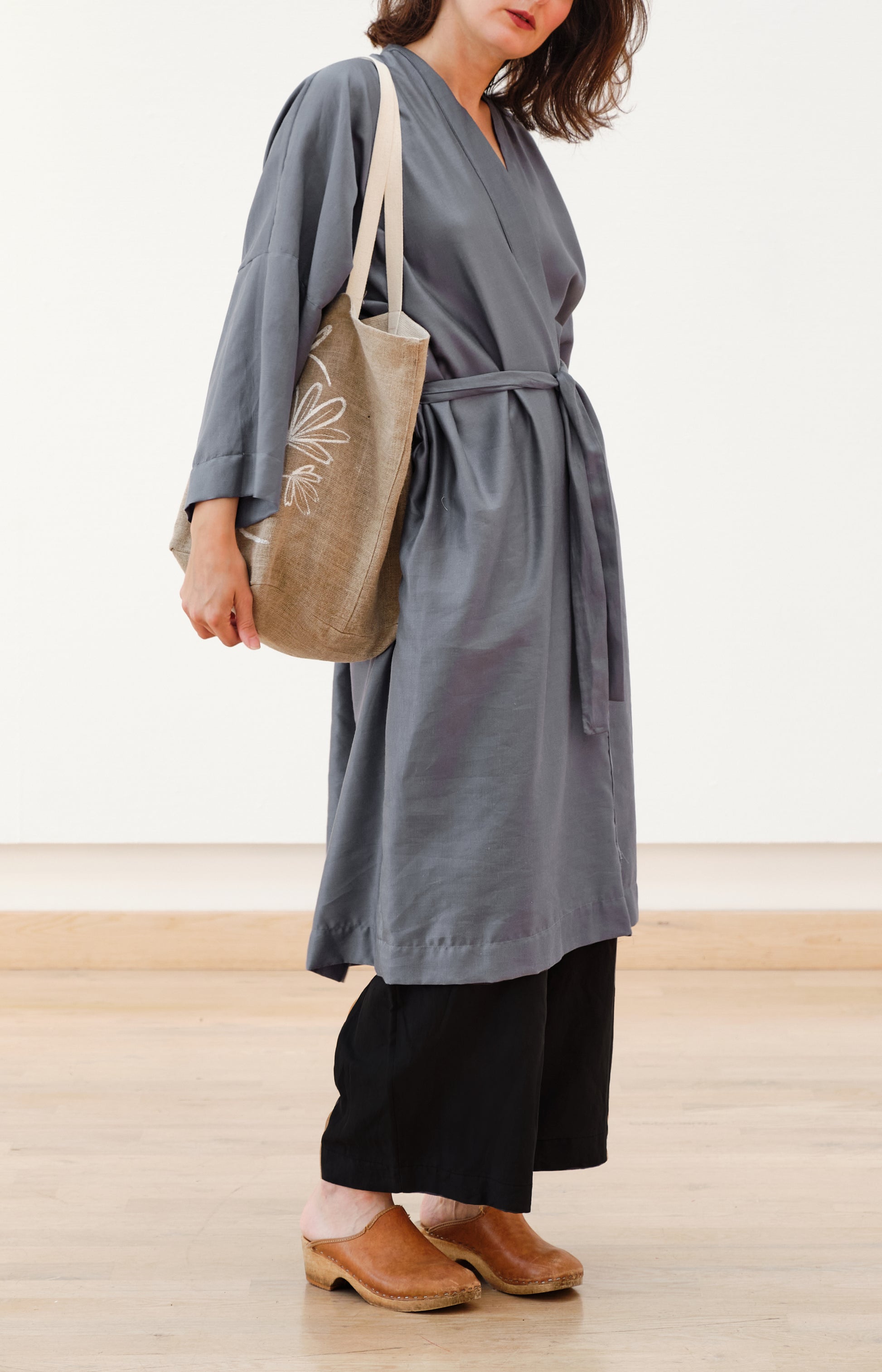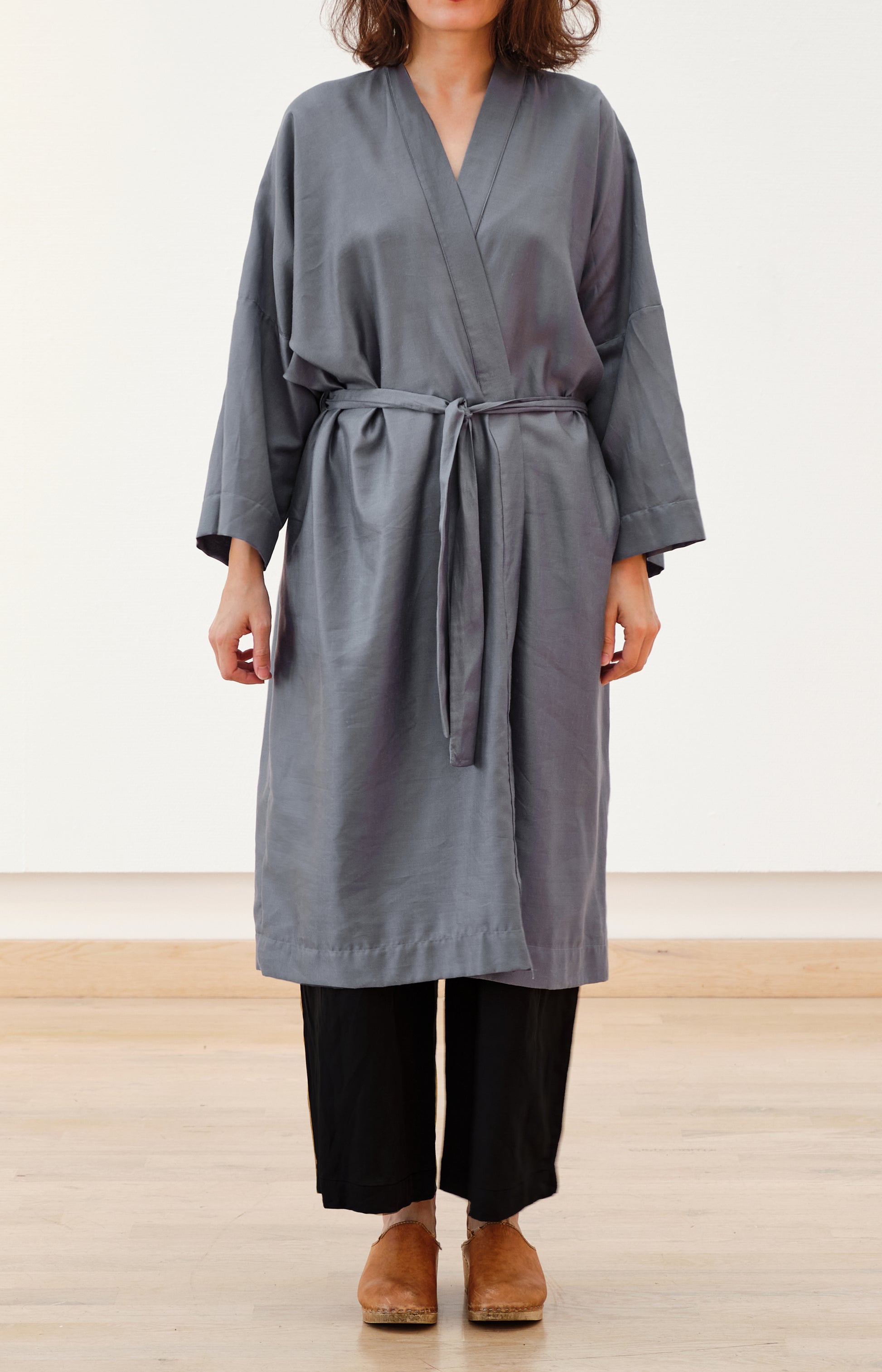The Sky Robe is made from a shiny silk blend. The robe is adjustable with a ribbon around the waist. Dropped shoulders.