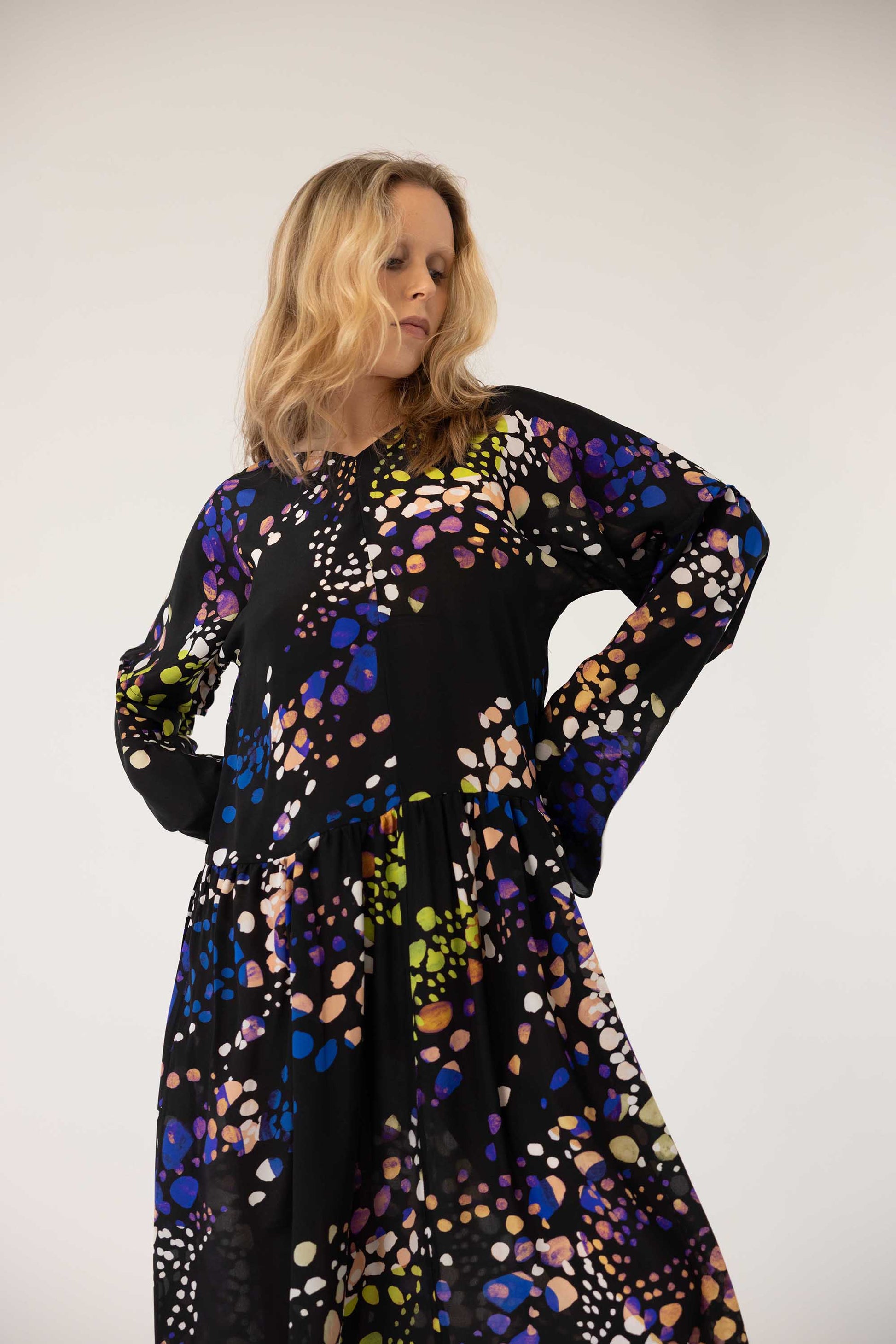 The Tinna Dress is made from lightweight, fluid silk that moves beautifully with the body. It features long sleeves and a flattering V-neckline. The pattern is hand-drawn in our studio and the dress is made in Iceland.