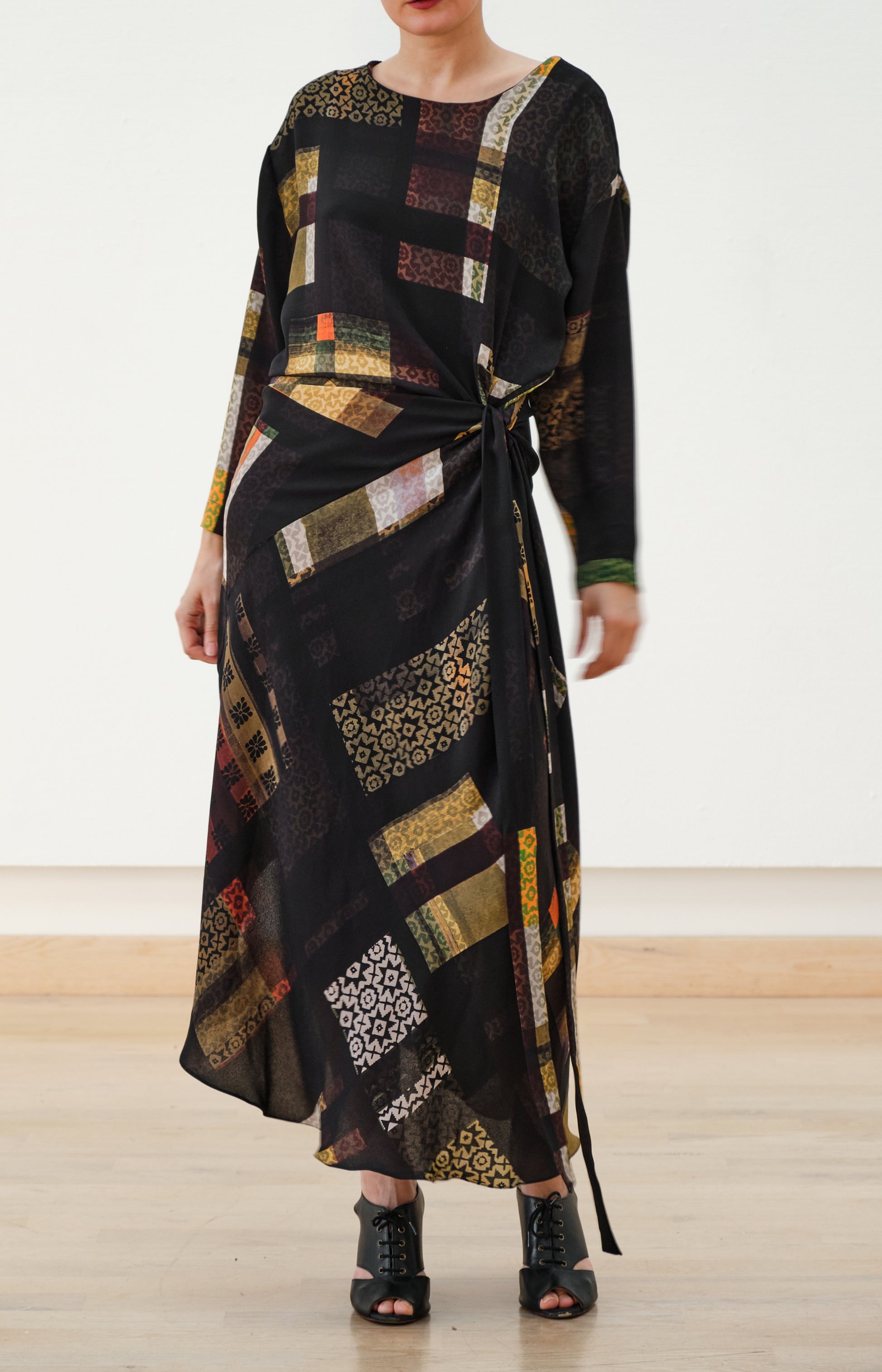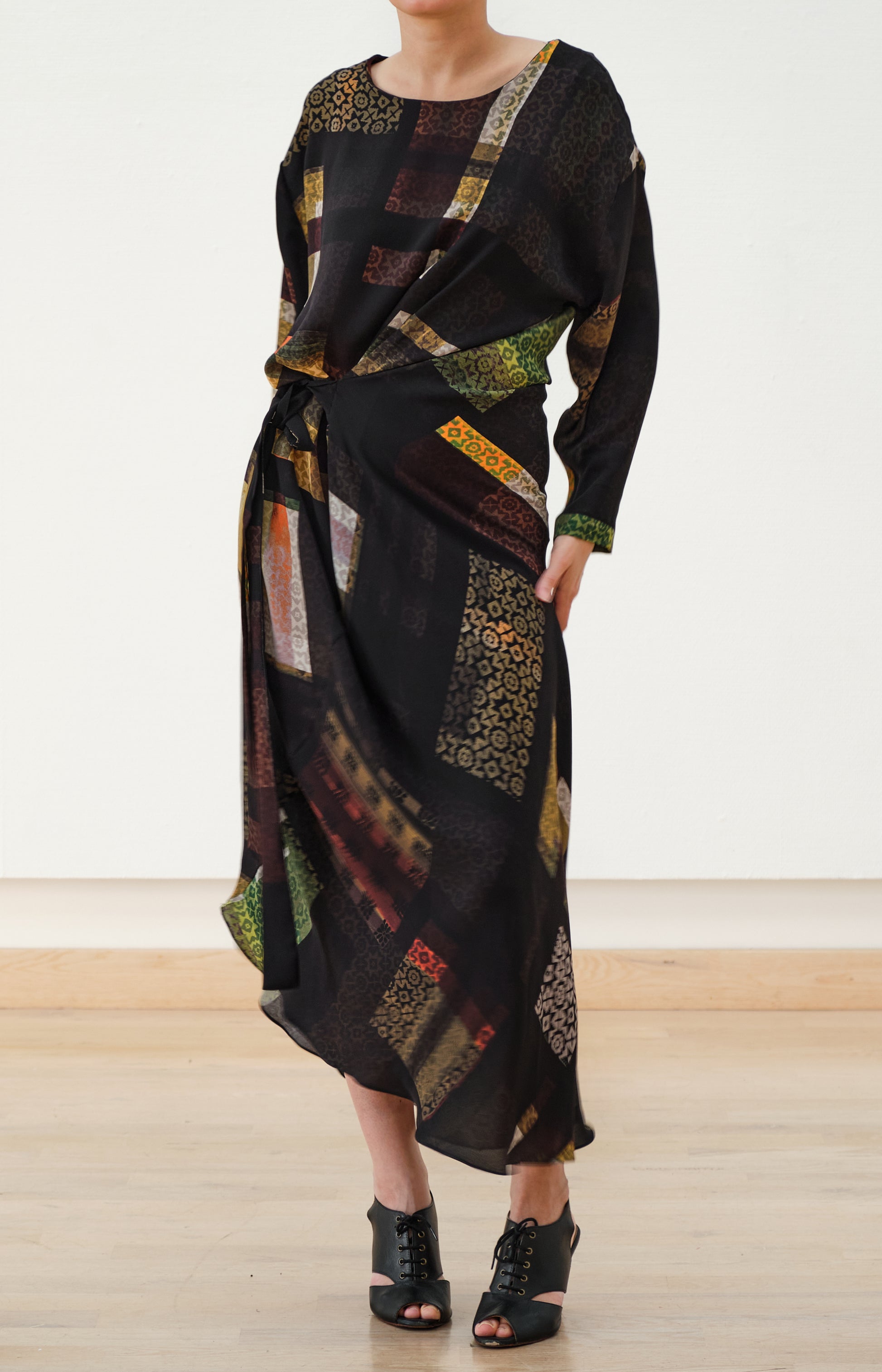 Our Knot dress in the Colorise print, made in 100% silk. Relaxed fit and dropped shoulder. Can be worn in different ways using the waistband. The skirt is cut on the bias of the fabric to give the dress a more fluid look.