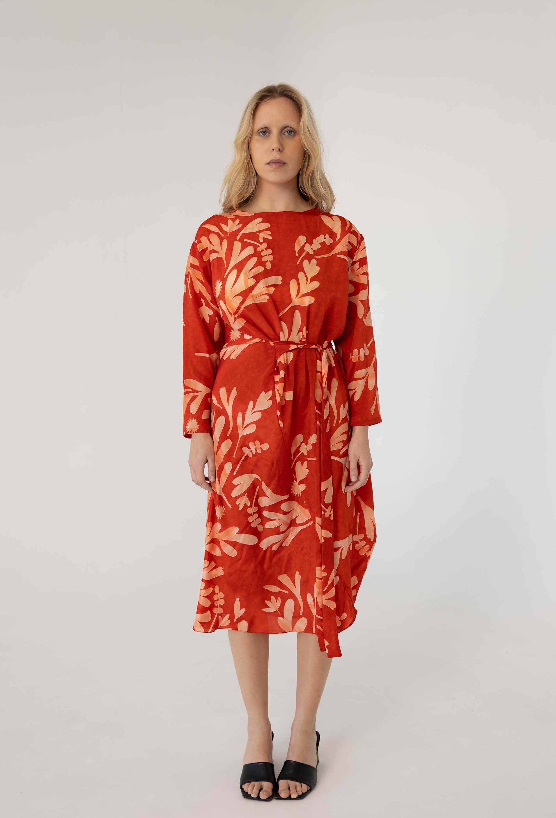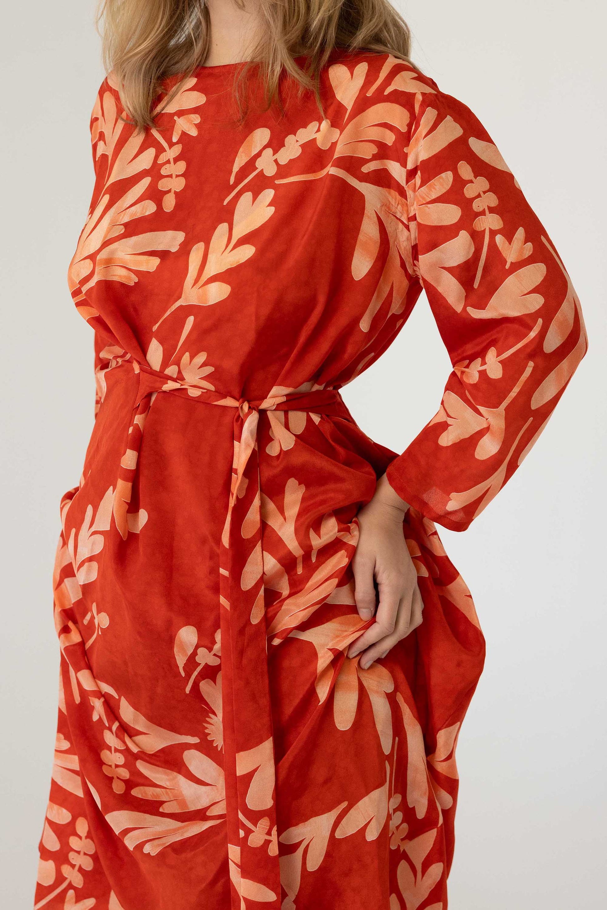 The Valentina Dress w/ sleeves is crafted from lightweight, fluid silk with a relaxed, asymmetrical silhouette. It features a dropped shoulder and a versatile design that can be styled in multiple ways. The skirt is cut on the bias, allowing the fabric to drape softly and enhance the dress’s fluid movement.